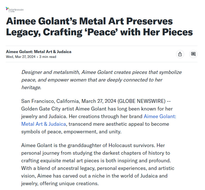 May 2024: Yahoo!Finance Article: Aimee Golant’s Metal Art Preserves Legacy, Crafting ‘Peace’ with Her Pieces.