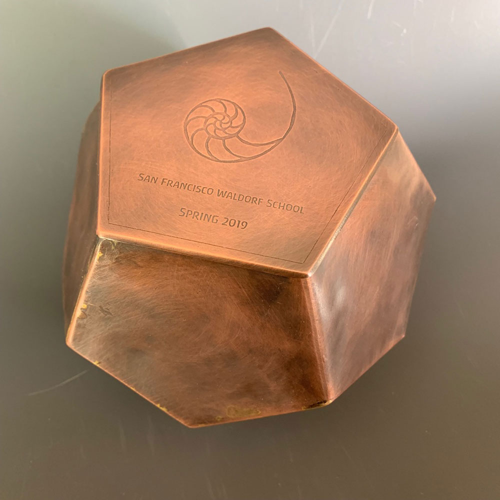 I have been the metal arts teacher at San Francisco Waldorf High School for over 15 years. I was deeply honored to receive this commission. This hollow form copper dodecahedron was created all from one sheet of copper which was scored, folded and bronze braised. It has a hinge and a clasp. It will be used as part of the Foundation Stone Ceremony, which will dedicate our new school building. The piece will be filled with writings and wishes for the school and for all of humanity. It will be placed below ground, buried in concrete, as part of the foundation. The upper lid with the San Francisco Waldorf School logo which has been etched will be visible from the sidewalk. Clear lacquer will be poured over the lid at the time of the ceremony.