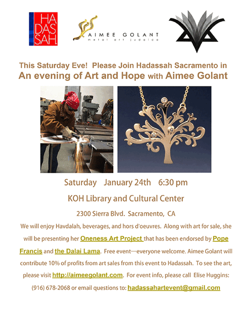 Local – Northern California (within a 3 hour drive each way): $400 – $500 (sliding scale) honorarium is requested. Power point presentations are tailored to each specific audience but are mostly focused on her Oneness Project that has been endorsed by the Dalai Lama and Pope Francis. The talk is around 45 minutes plus time for questions. A private showing of related metal art jewelry and Judaica for sale with 10% of profits benefiting the host organization may be requested for an additional $400.