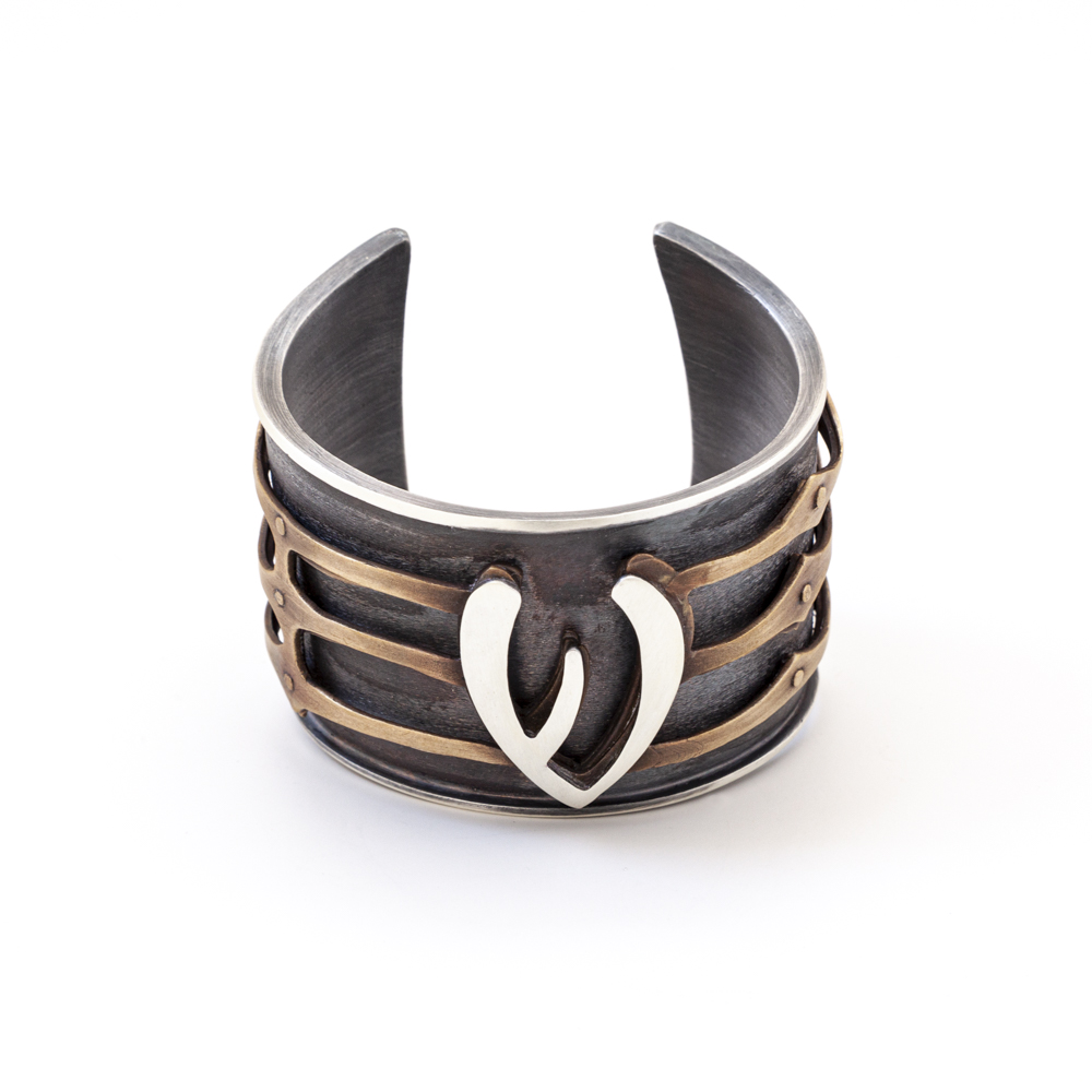 This unisex cuff bracelet is sterling silver with a bronze “gate” and a center shin in either sterling silver or 14K gold. It is a heavy piece, meant for the wearer to “know” it’s on. The design depicts the ancient Hebrew Priestly Blessing on the inside. To find out more information about the priestly blessing and my inspiration, please visit the blog titled: “Priestly Blessing Bracelets for Jewish Wonder Woman(men)”.