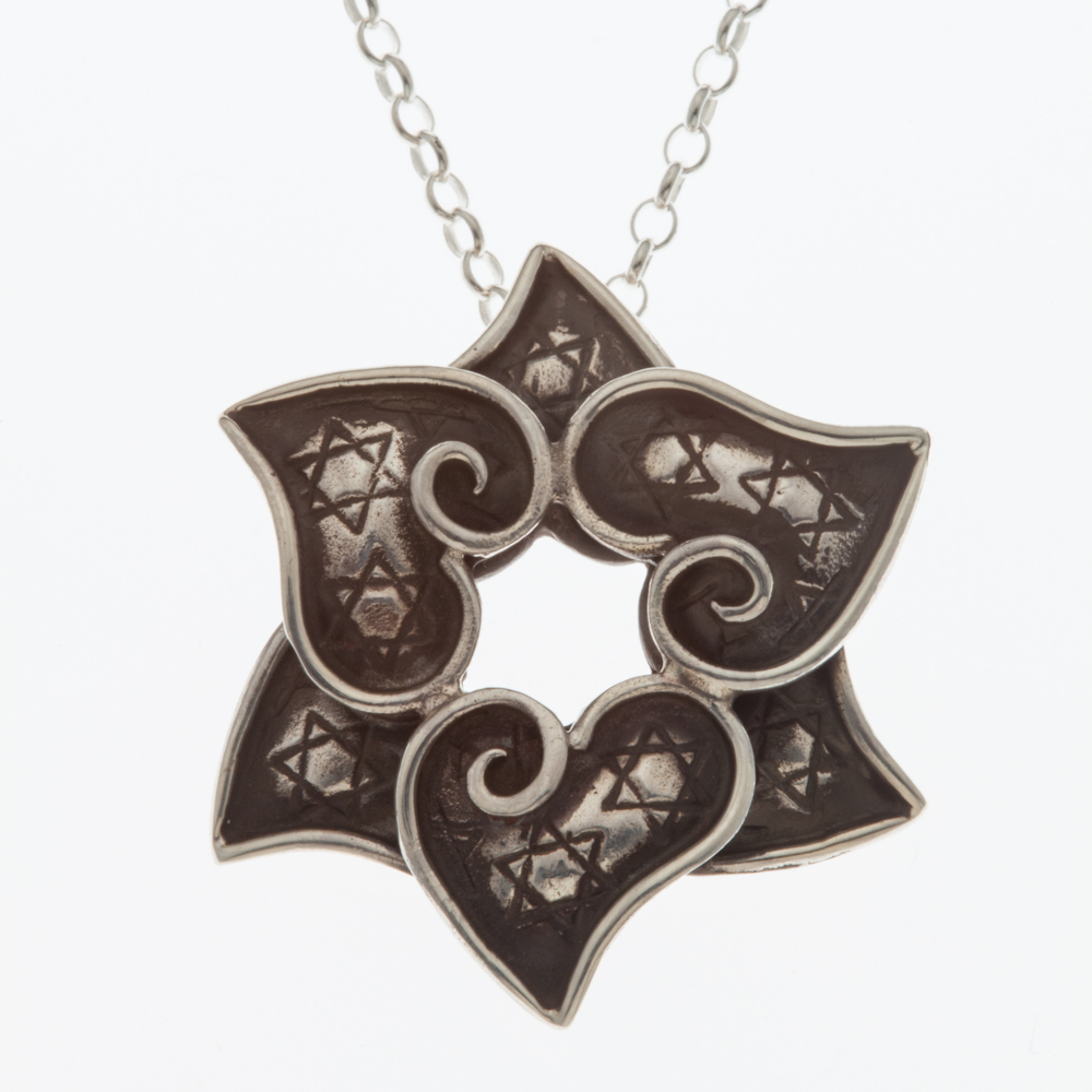This is a bold and beautiful piece of sterling silver jewelry. At first glance, you see the outer graceful, snow-flake like six pointed star, then you look closer to see all of the spiral hearts. Look even closer to notice the stars of David within the hearts. One more look, and you see the inner star in the central negative space within the piece. This is a wonderful gift for Mother’s Day or for any special woman in your life.